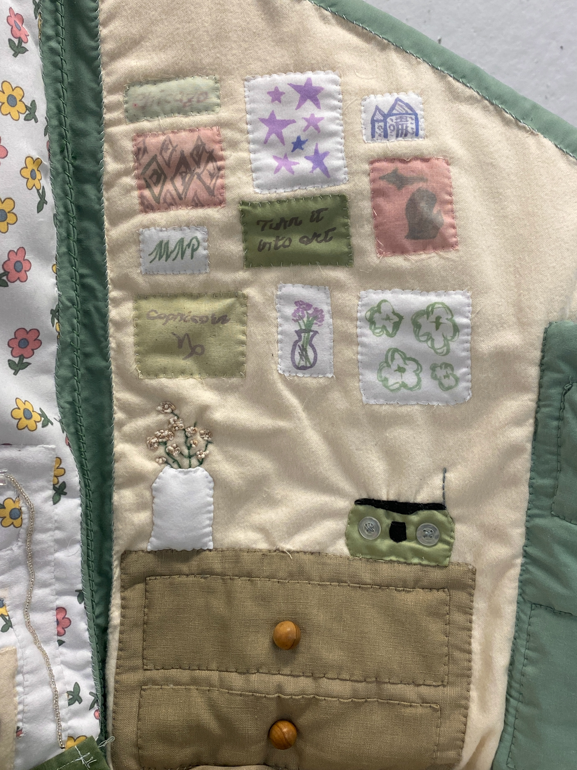Hand-dyed cotton fabric, found fabric, beads, buttons, wire, embroidery thread, yarn, ribbon, heat press graphics, found objects
