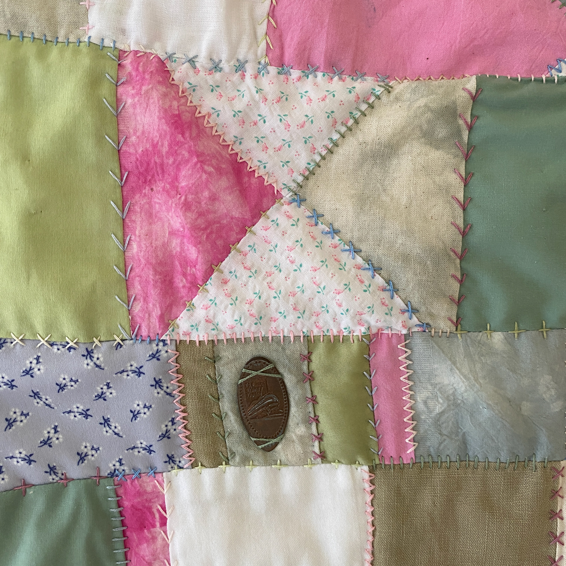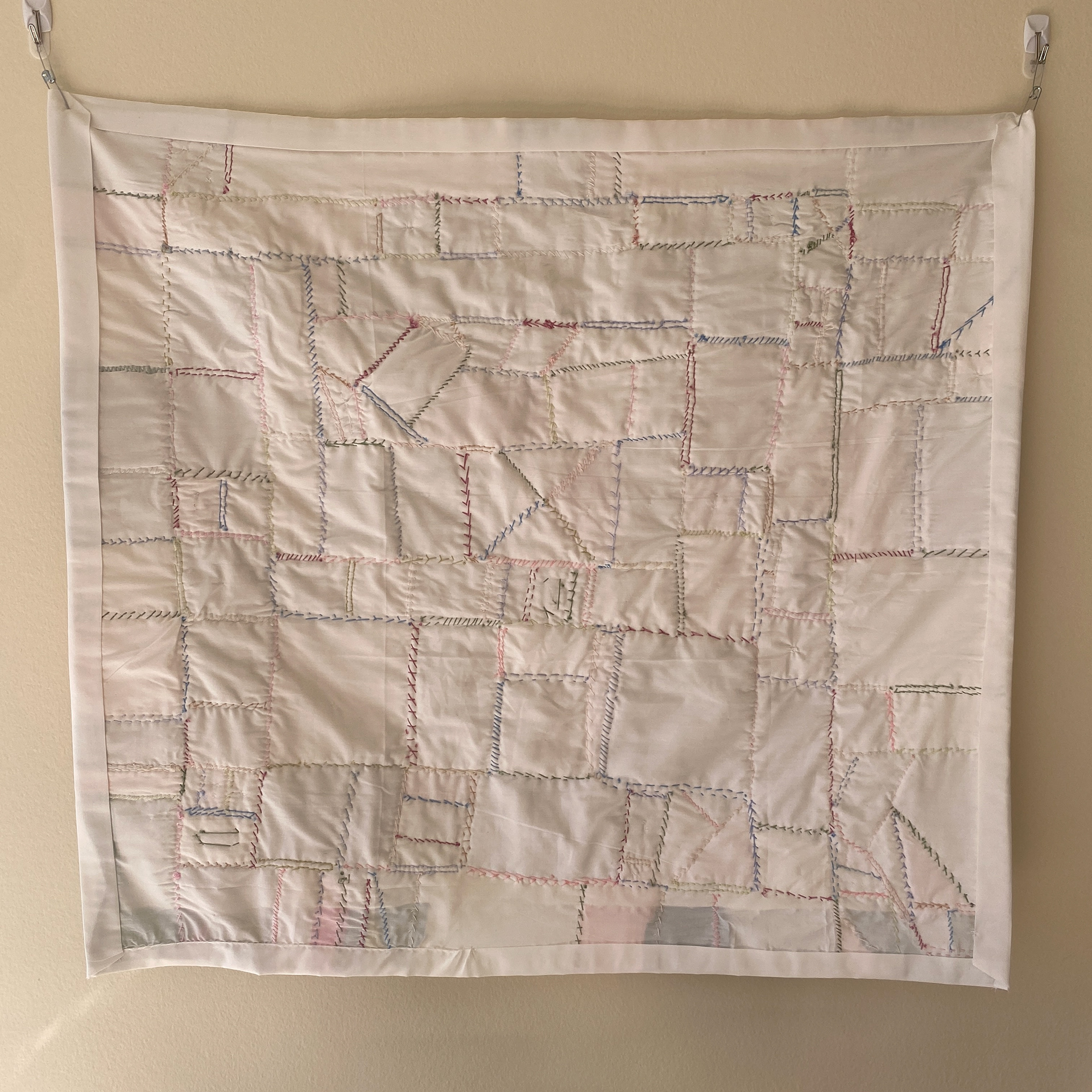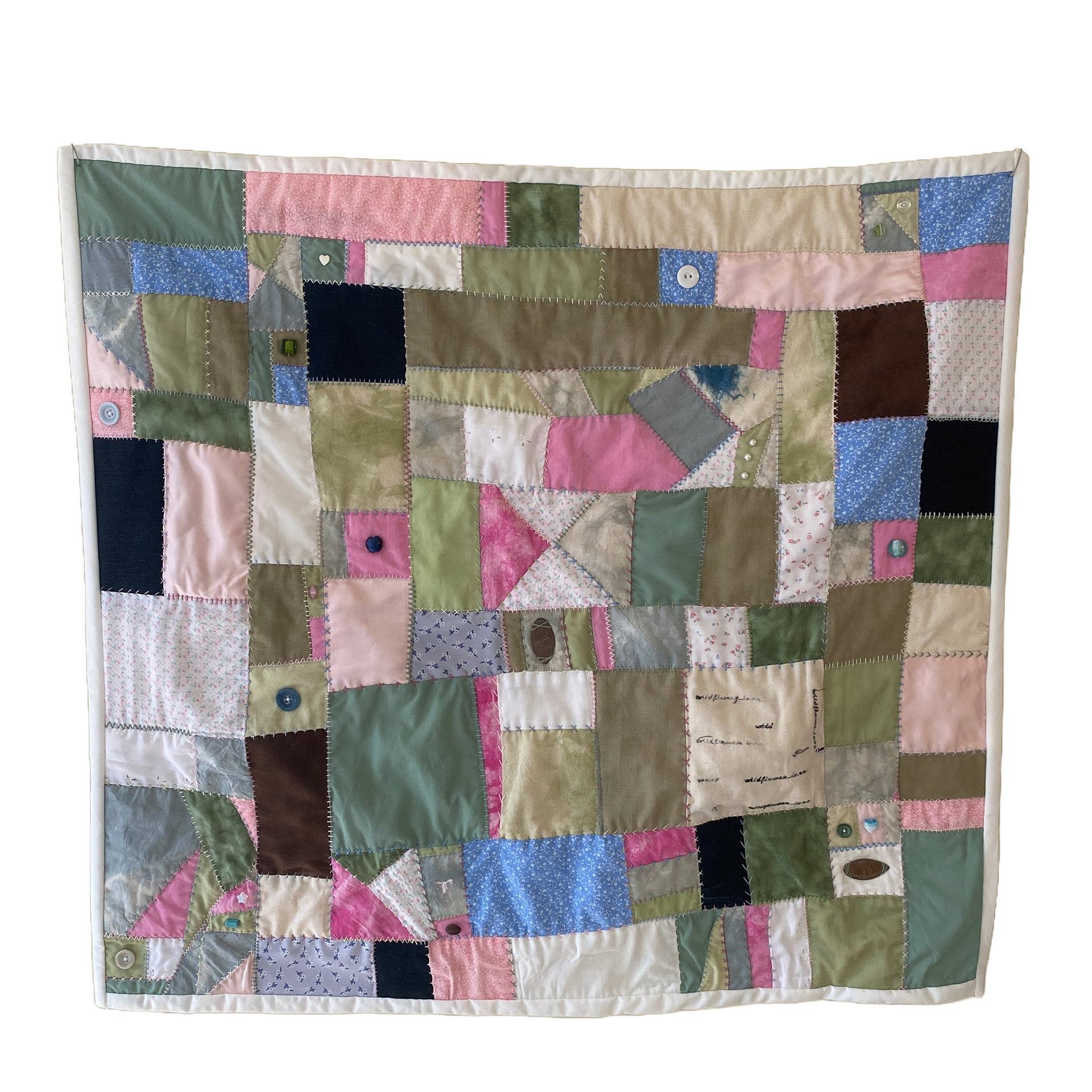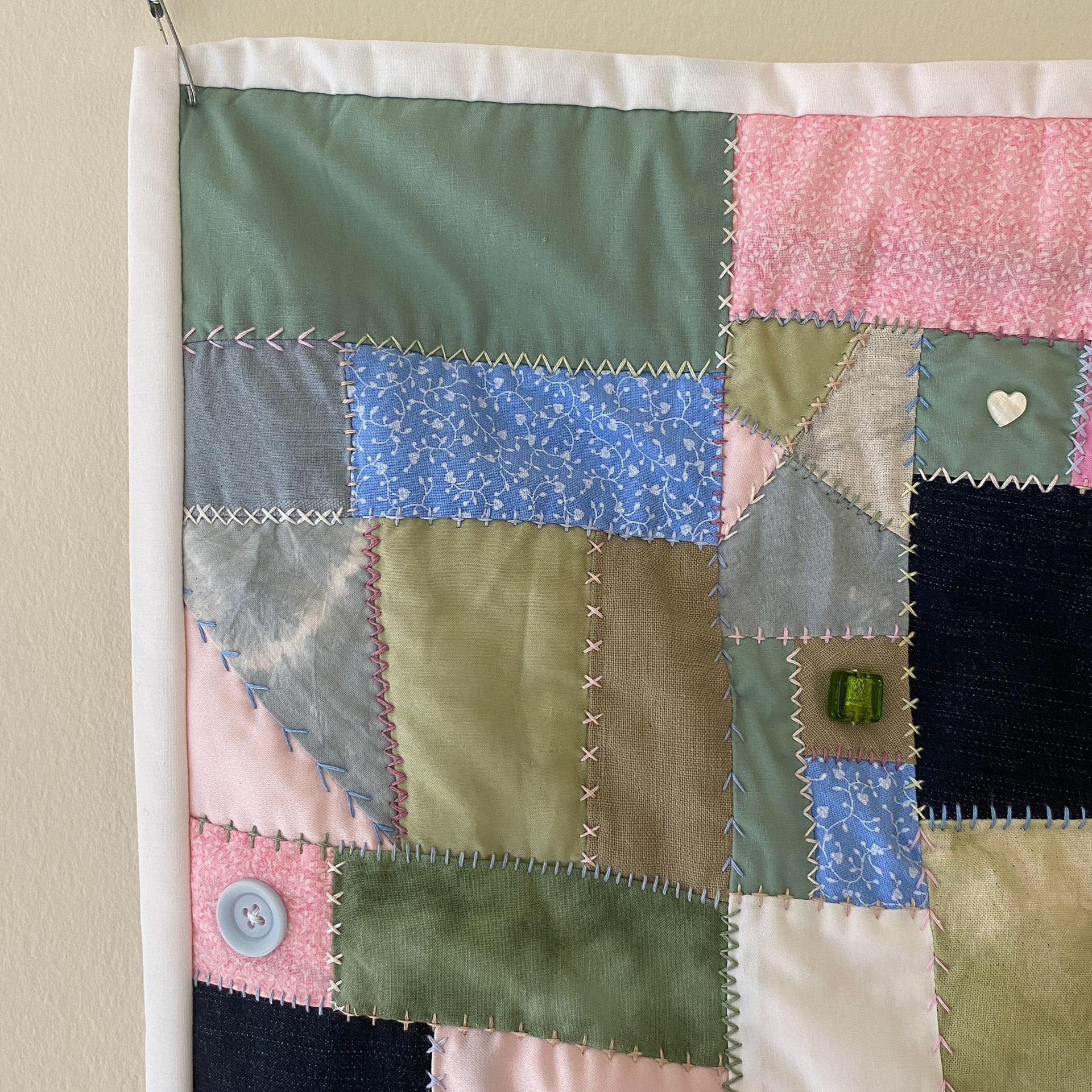 Hand-dyed cotton fabric, found fabric, buttons, beads, found objects, cotton embroidery thread (31" x 28.5")
